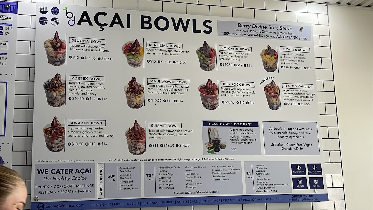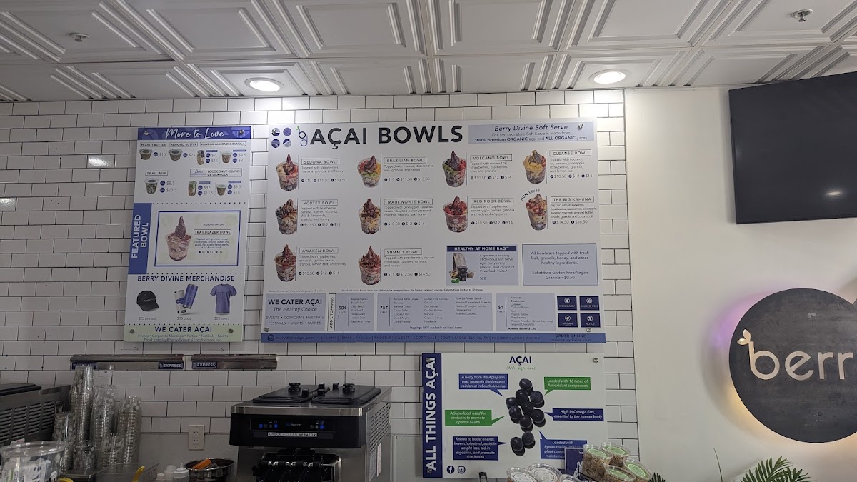 Berry Divine Açaí Bowls offers a refreshing and diverse menu that perfectly caters to those seeking healthy and delicious meal options. Their Soft Serve Açaí Bowls are a highlight, with choices like the vibrant Sedona Bowl, packed with fruity goodness, or the exotic Brazilian Bowl, which takes your taste buds to South America with its mix of tropical flavors. For something a little more adventurous, the Volcano Bowl brings a bold twist, while the Vortex Bowl and Maui Wowie Bowl combine refreshing ingredients for a satisfying treat. Each bowl offers unique toppings and combinations to suit various preferences.